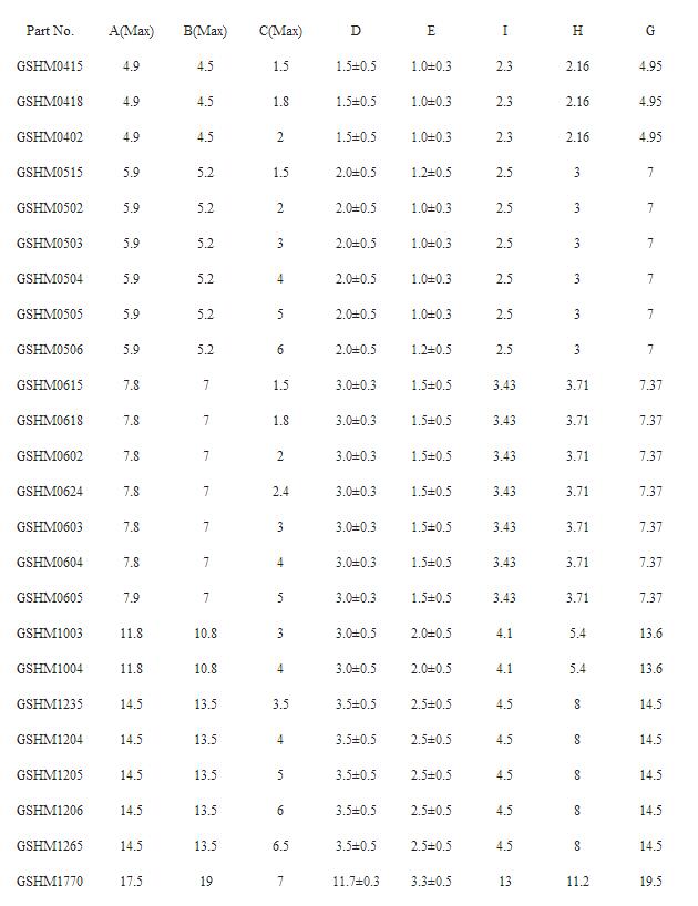 四、一體成型電感封裝尺寸列表: